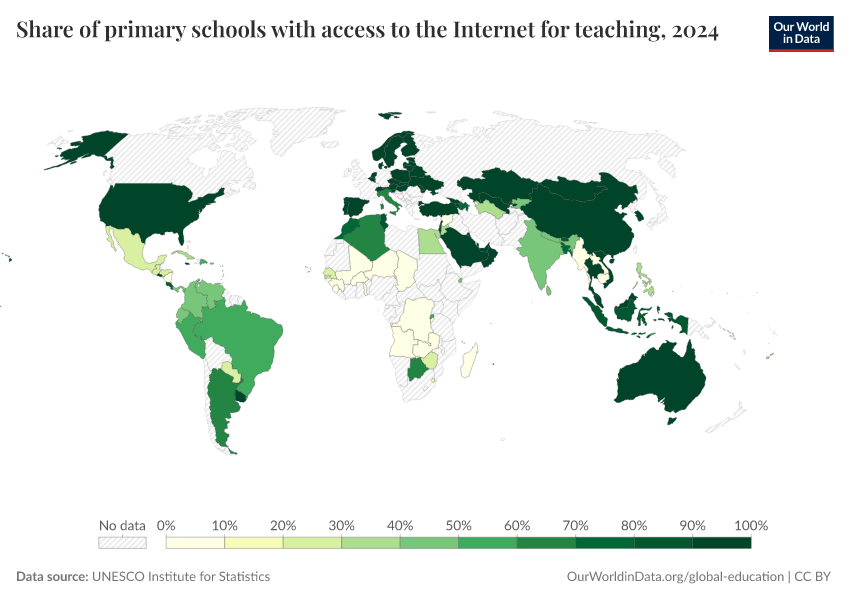 “Data Page: Share of primary schools with access to the Internet for teaching”. Our World in Data (2026). Data adapted from UNESCO Institute for Statistics. Retrieved from https://drop-density-mdim.owid.pages.dev:8789/20260130-180113/grapher/primary-schools-with-access-to-internet.html [online resource] (archived on January 30, 2026).How to cite this data