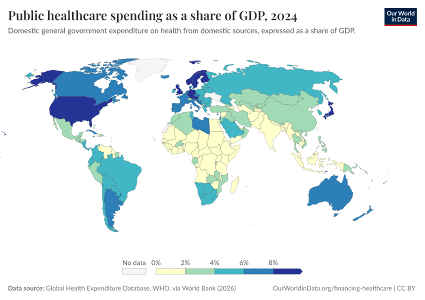 “Data Page: Public healthcare spending as a share of GDP”. Our World in Data (2026). Data adapted from Global Health Expenditure Database, WHO, via World Bank. Retrieved from https://drop-density-mdim.owid.pages.dev:8789/20260202-181317/grapher/public-healthcare-spending-share-gdp.html [online resource] (archived on February 2, 2026).How to cite this data