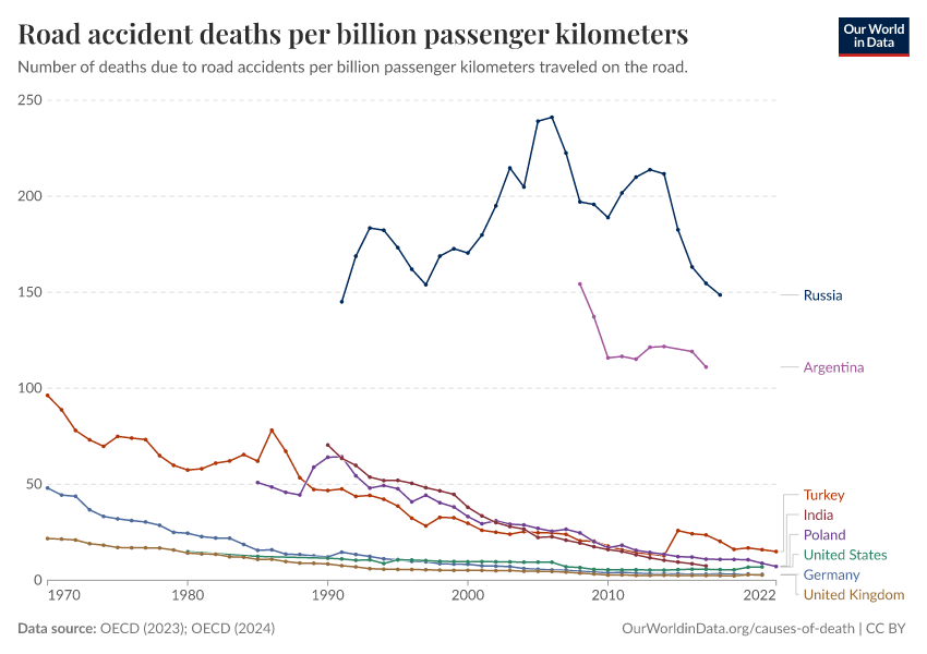 “Data Page: Road accident deaths per billion passenger kilometers”, part of the following publication: Hannah Ritchie and Max Roser (2021) - “Transport”. Data adapted from OECD. Retrieved from https://drop-density-mdim.owid.pages.dev:8789/20250909-093708/grapher/road-accident-deaths-per-passenger-kilometers.html [online resource] (archived on September 9, 2025).How to cite this data