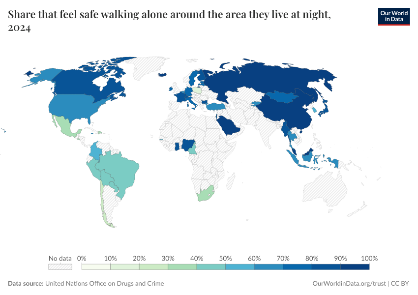 “Data Page: Share that feel safe walking alone around the area they live at night”. Our World in Data (2026). Data adapted from United Nations Office on Drugs and Crime. Retrieved from https://drop-density-mdim.owid.pages.dev:8789/20251120-211749/grapher/safety-walking-alone.html [online resource] (archived on November 20, 2025).How to cite this data