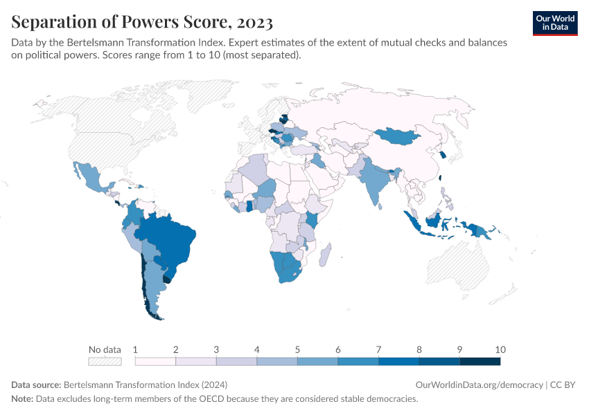 “Data Page: Separation of Powers Score”, part of the following publication: Bastian Herre, Lucas Rodés-Guirao, and Esteban Ortiz-Ospina (2013) - “Democracy”. Data adapted from Bertelsmann Transformation Index. Retrieved from https://drop-density-mdim.owid.pages.dev:8789/20260204-165456/grapher/separation-of-powers-score-bti.html [online resource] (archived on February 4, 2026).How to cite this data