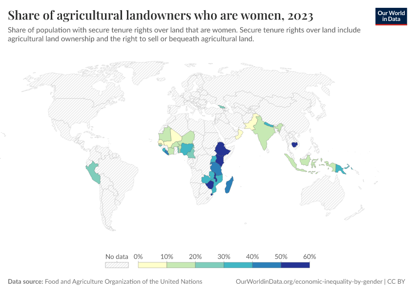 “Data Page: Share of agricultural landowners who are women”. Our World in Data (2026). Data adapted from Food and Agriculture Organization of the United Nations. Retrieved from https://drop-density-mdim.owid.pages.dev:8789/20260105-133053/grapher/share-of-agricultural-land-owners-that-are-women.html [online resource] (archived on January 5, 2026).How to cite this data