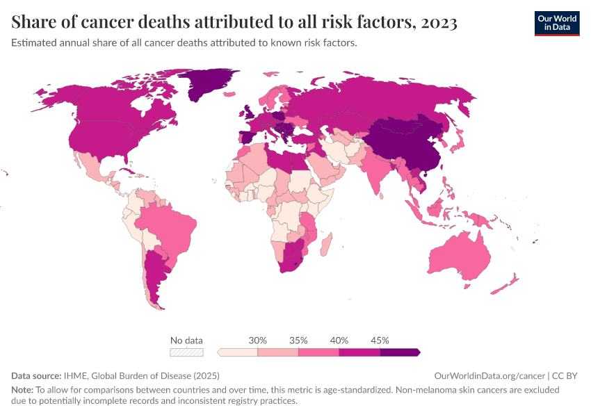 IHME, Global Burden of Disease (2025) – processed by Our World in Data. “Share of cancer deaths attributed to all risk factors” [dataset]. IHME, Global Burden of Disease, “Global Burden of Disease - Risk Factors for Cancer Deaths” [original data]. Retrieved February 25, 2026 from https://drop-density-mdim.owid.pages.dev:8789/20260213-144351/grapher/share-of-cancer-deaths-attributed-to-all-risk-factors.html (archived on February 13, 2026).