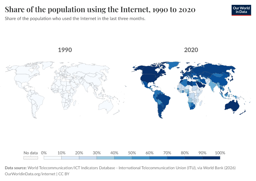 “Data Page: Share of the population using the Internet”, part of the following publication: Hannah Ritchie, Edouard Mathieu, Max Roser, and Esteban Ortiz-Ospina (2023) - “Internet”. Data adapted from World Telecommunication/ICT Indicators Database - International Telecommunication Union (ITU), via World Bank. Retrieved from https://drop-density-mdim.owid.pages.dev:8789/20260202-181317/grapher/share-of-individuals-using-the-internet.html [online resource] (archived on February 2, 2026).