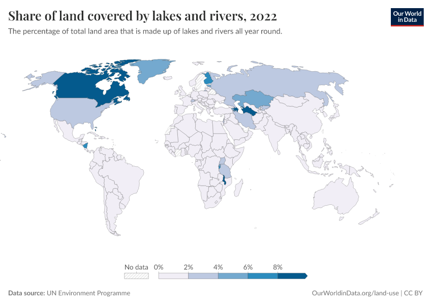 “Data Page: Share of land covered by lakes and rivers”. Our World in Data (2026). Data adapted from UN Environment Programme. Retrieved from https://drop-density-mdim.owid.pages.dev:8789/20260130-180113/grapher/share-of-land-covered-by-lakes-and-rivers.html [online resource] (archived on January 30, 2026).How to cite this data