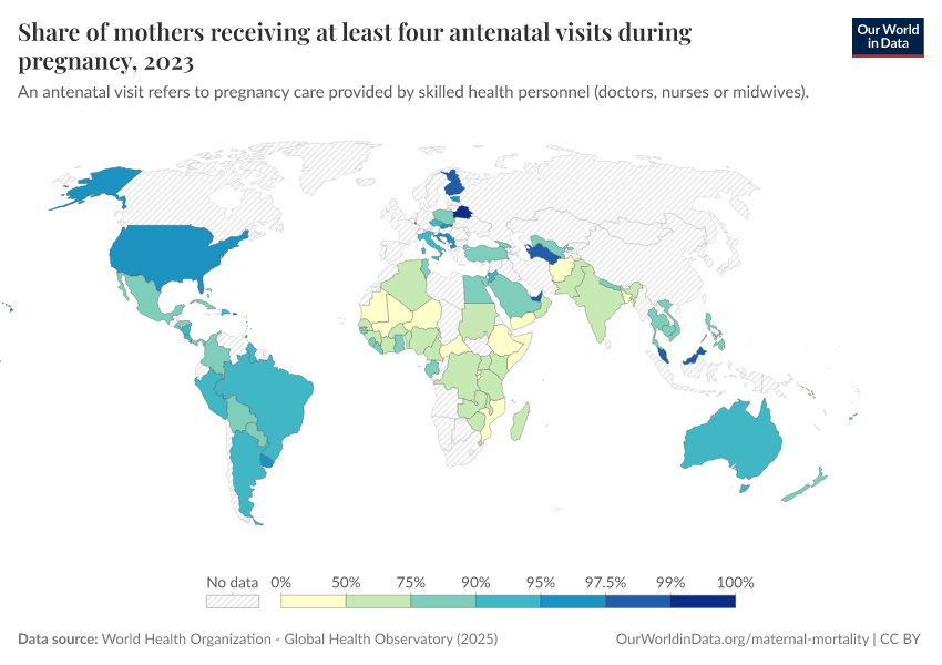 World Health Organization - Global Health Observatory (2025) – processed by Our World in Data. “Share of mothers receiving at least four antenatal visits during pregnancy” [dataset]. World Health Organization, “Global Health Observatory” [original data]. Retrieved February 25, 2026 from https://drop-density-mdim.owid.pages.dev:8789/20250909-093708/grapher/share-of-mothers-receiving-at-least-four-antenatal-visits-during-pregnancy.html (archived on September 9, 2025).
