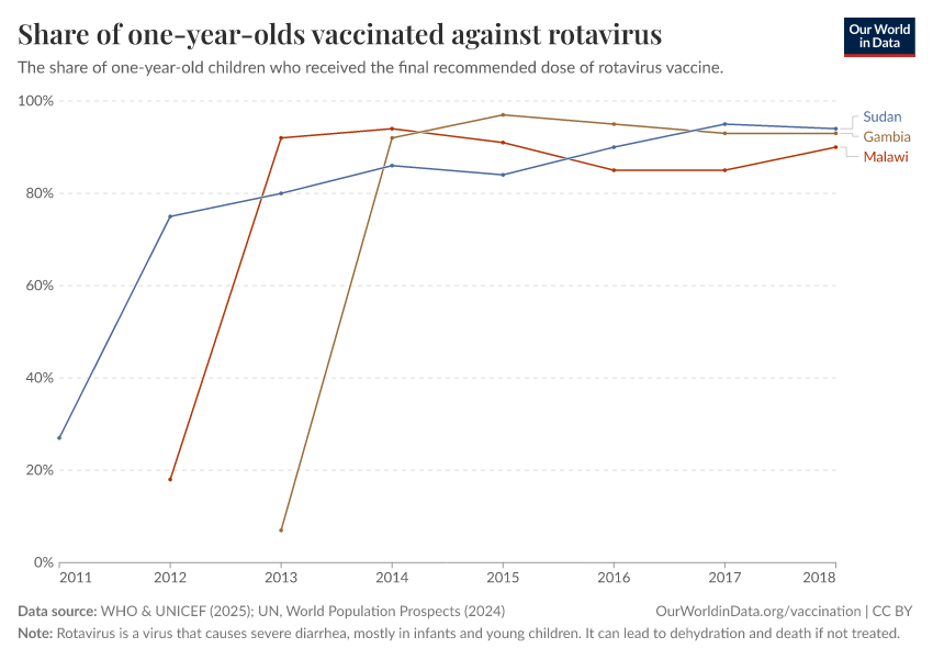 “Data Page: Share of one-year-olds vaccinated against rotavirus”, part of the following publication: Fiona Spooner, Saloni Dattani, Samantha Vanderslott, and Max Roser (2022) - “Vaccination”. Data adapted from WHO & UNICEF, United Nations. Retrieved from https://drop-density-mdim.owid.pages.dev:8789/20260119-070102/grapher/share-of-one-year-olds-who-received-the-rotavirus-vaccine.html [online resource] (archived on January 19, 2026).How to cite this data