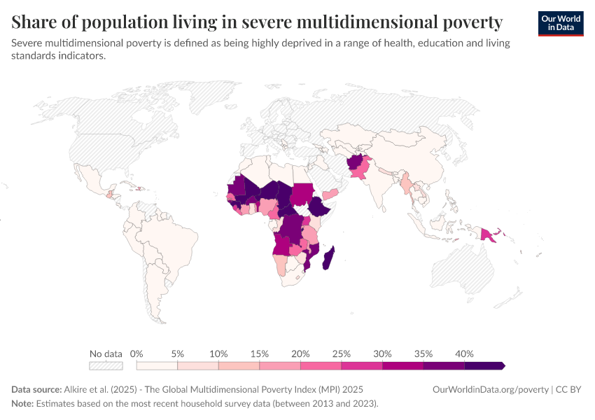 “Data Page: Share of population living in severe multidimensional poverty”, part of the following publication: Joe Hasell, Bertha Rohenkohl, Pablo Arriagada, Esteban Ortiz-Ospina, and Max Roser (2022) - “Poverty”. Data adapted from Alkire et al.. Retrieved from https://drop-density-mdim.owid.pages.dev:8789/20251229-175603/grapher/share-of-population-in-severe-multidimensional-poverty.html [online resource] (archived on December 29, 2025).How to cite this data