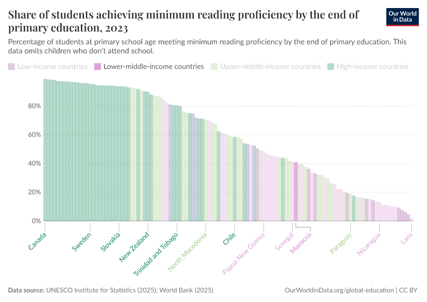 “Data Page: Share of students achieving minimum reading proficiency by the end of primary education”, part of the following publication: Hannah Ritchie, Veronika Samborska, Esteban Ortiz-Ospina, and Max Roser (2023) - “Global Education”. Data adapted from UNESCO Institute for Statistics. Retrieved from https://drop-density-mdim.owid.pages.dev:8789/20260122-091445/grapher/share-of-students-at-end-of-primary-education-achieving-minimum-reading-proficiency.html [online resource] (archived on January 22, 2026).How to cite this data