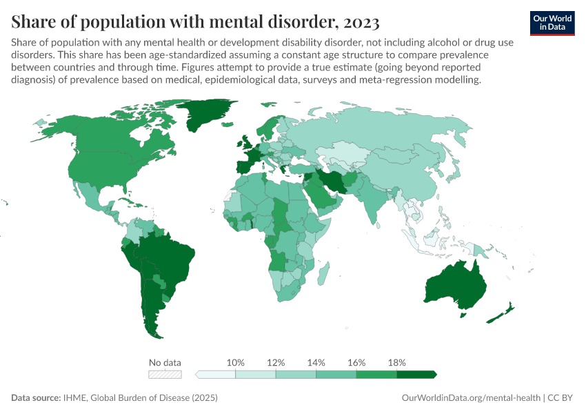 IHME, Global Burden of Disease (2025) – with major processing by Our World in Data. “Share of population with mental disorder” [dataset]. IHME, Global Burden of Disease, “Global Burden of Disease - Mental Health Prevalence” [original data]. Retrieved February 25, 2026 from https://drop-density-mdim.owid.pages.dev:8789/20260212-100858/grapher/share-with-mental-health-or-development-disorder.html (archived on February 12, 2026).