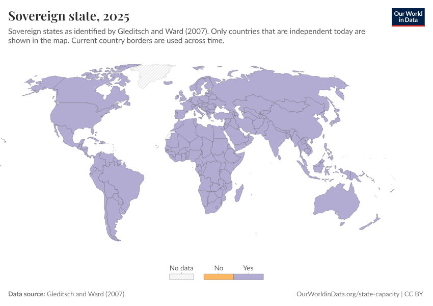 “Data Page: Sovereign state”, part of the following publication: Bastian Herre and Pablo Arriagada (2023) - “State Capacity”. Data adapted from Gleditsch and Ward. Retrieved from https://drop-density-mdim.owid.pages.dev:8789/20260119-070102/grapher/sovereign-state-gleditsch-ward.html [online resource] (archived on January 19, 2026).How to cite this data