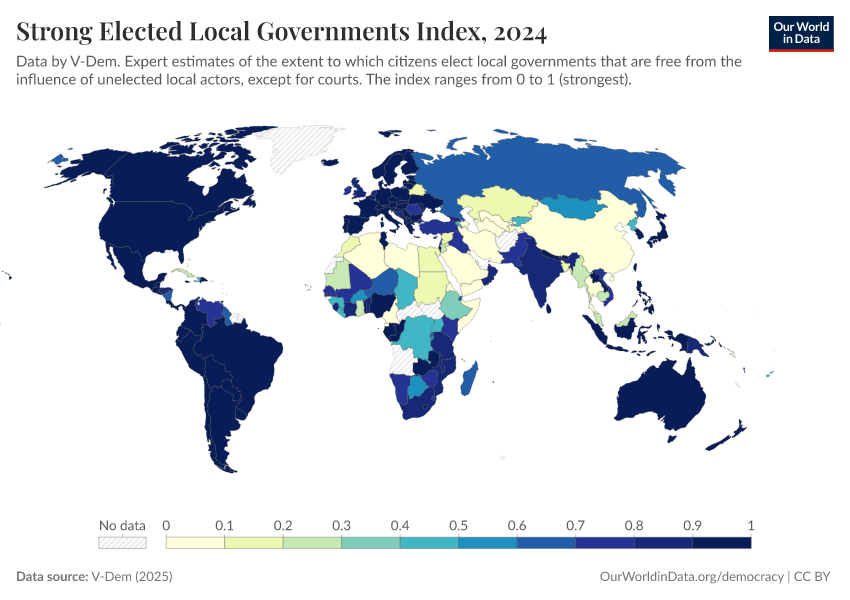 V-Dem (2025) – processed by Our World in Data. “Elected local governments – V-Dem” [dataset]. V-Dem, “Democracy report v15” [original data]. Retrieved February 25, 2026 from https://drop-density-mdim.owid.pages.dev:8789/20260119-070102/grapher/strong-elected-local-governments-index.html (archived on January 19, 2026).
