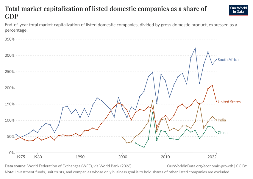 “Data Page: Total market capitalization of listed domestic companies as a share of GDP”. Our World in Data (2026). Data adapted from World Federation of Exchanges (WFE), via World Bank. Retrieved from https://drop-density-mdim.owid.pages.dev:8789/20260202-181317/grapher/total-market-capitalization-listed-domestic-companies-share-gdp.html [online resource] (archived on February 2, 2026).How to cite this data