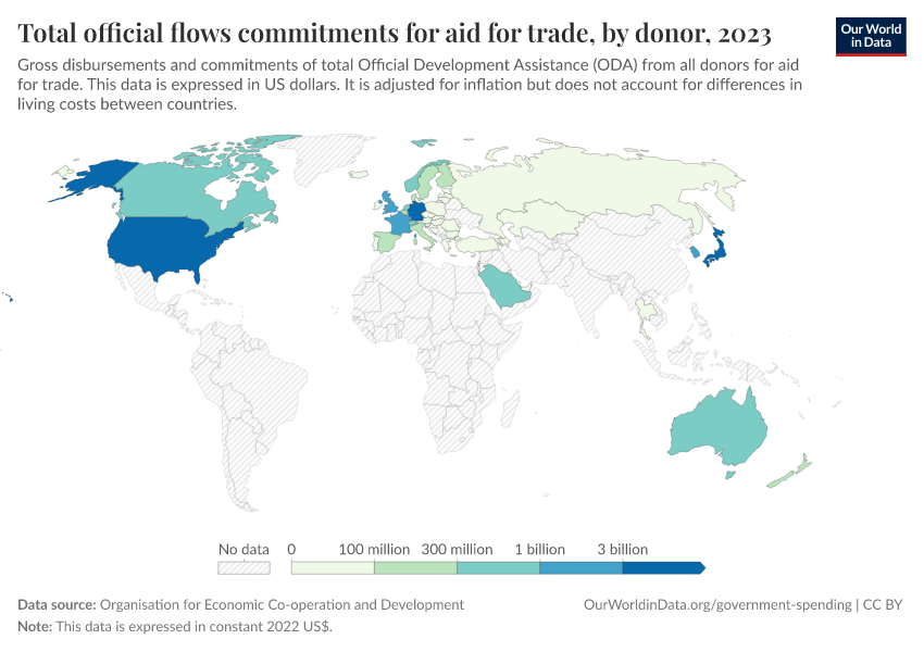 “Data Page: Total official flows commitments for aid for trade, by donor”. Our World in Data (2026). Data adapted from Organisation for Economic Co-operation and Development. Retrieved from https://drop-density-mdim.owid.pages.dev:8789/20251120-211038/grapher/total-oda-for-aid-for-trade-by-donor.html [online resource] (archived on November 20, 2025).How to cite this data