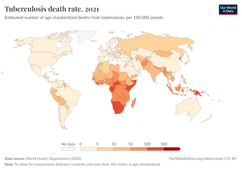 World Health Organization (2024) – with major processing by Our World in Data. “Tuberculosis death rate” [dataset]. World Health Organization, “Global Health Estimates” [original data]. Retrieved February 25, 2026 from https://drop-density-mdim.owid.pages.dev:8789/20250909-093708/grapher/tuberculosis-death-rate-age-standardized.html (archived on September 9, 2025).