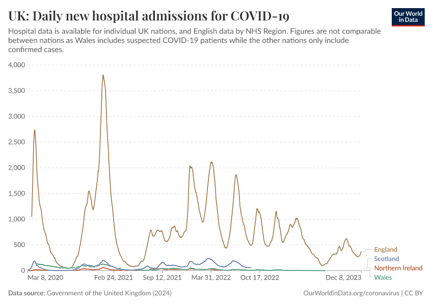 Government of the United Kingdom (2024) – with minor processing by Our World in Data. “UK: Daily new hospital admissions for COVID-19” [dataset]. Government of the United Kingdom, “UKHSA data dashboard” [original data]. Retrieved February 25, 2026 from https://drop-density-mdim.owid.pages.dev:8789/20250909-093708/grapher/uk-daily-covid-admissions.html (archived on September 9, 2025).
