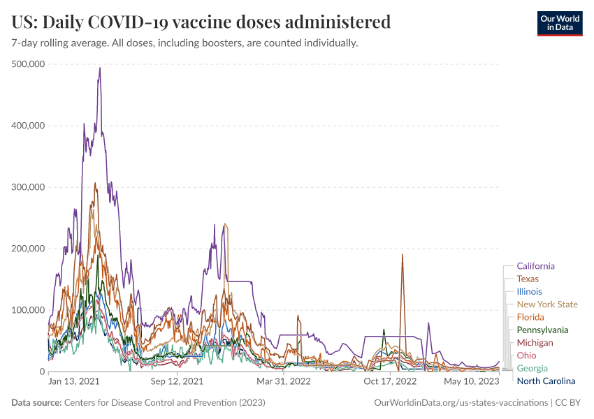Centers for Disease Control and Prevention (2023) – processed by Our World in Data. “US: Daily COVID-19 vaccine doses administered” [dataset]. Centers for Disease Control and Prevention, “COVID-19, Vaccinations (United States)” [original data]. Retrieved February 25, 2026 from https://drop-density-mdim.owid.pages.dev:8789/20250909-093708/grapher/us-daily-covid-vaccine-doses-administered.html (archived on September 9, 2025).