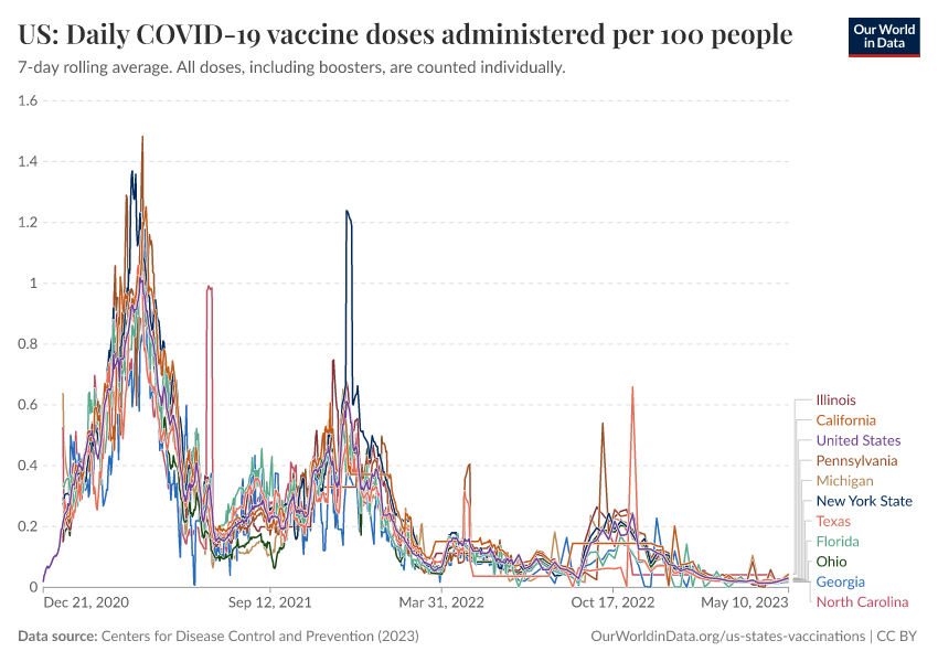 Centers for Disease Control and Prevention (2023) – processed by Our World in Data. “US: Daily COVID-19 vaccine doses administered per 100 people” [dataset]. Centers for Disease Control and Prevention, “COVID-19, Vaccinations (United States)” [original data]. Retrieved February 25, 2026 from https://drop-density-mdim.owid.pages.dev:8789/20250909-093708/grapher/us-daily-covid-vaccine-doses-per-100.html (archived on September 9, 2025).