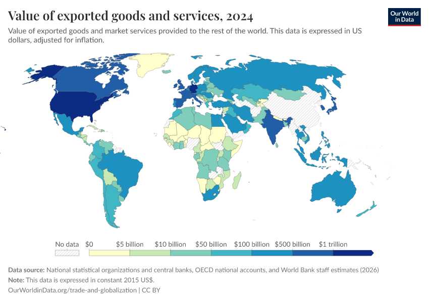 “Data Page: Value of exported goods and services”. Our World in Data (2026). Data adapted from National statistical organizations and central banks, OECD national accounts, and World Bank staff estimates. Retrieved from https://drop-density-mdim.owid.pages.dev:8789/20260202-181317/grapher/value-of-exported-goods-and-services.html [online resource] (archived on February 2, 2026).How to cite this data