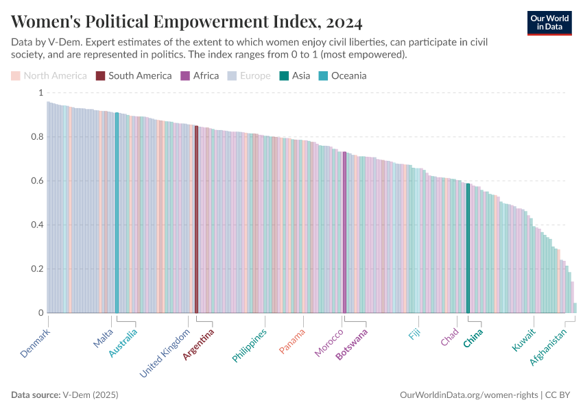 “Data Page: Women's political empowerment index”, part of the following publication: Bastian Herre, Lucas Rodés-Guirao, and Esteban Ortiz-Ospina (2013) - “Democracy”. Data adapted from V-Dem. Retrieved from https://drop-density-mdim.owid.pages.dev:8789/20260119-070102/grapher/women-political-empowerment-index.html [online resource] (archived on January 19, 2026).