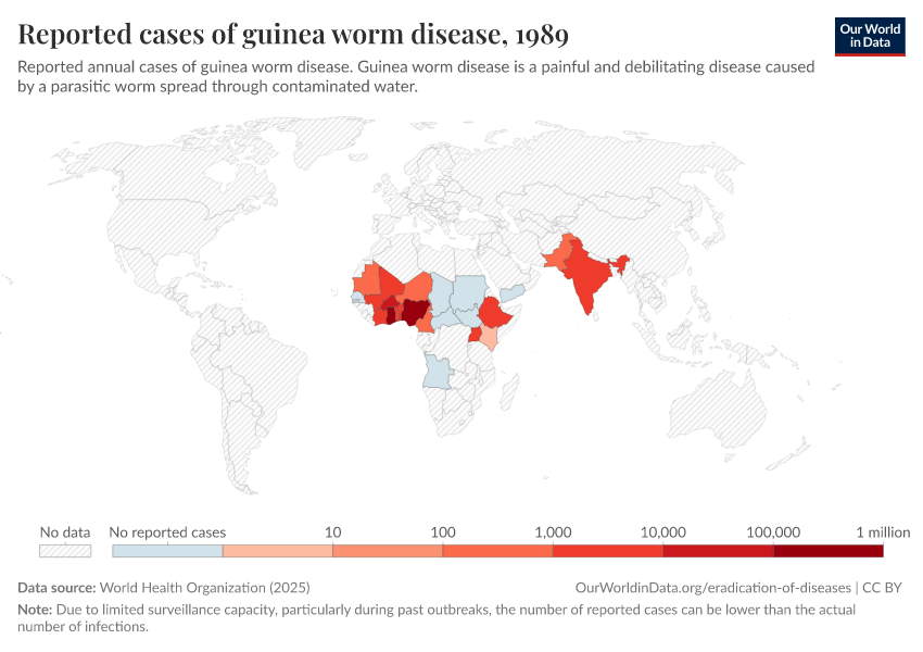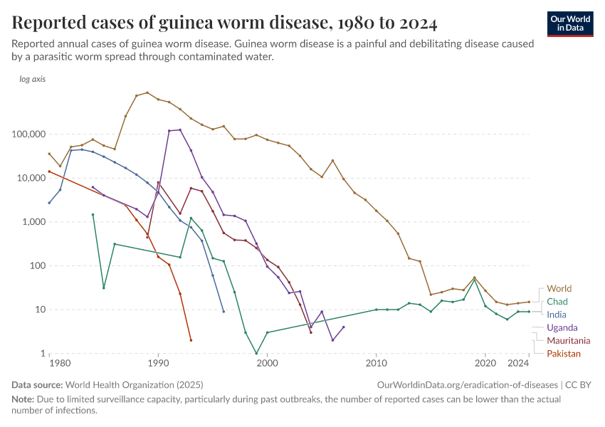 Saloni Dattani and Fiona Spooner (2022) - “Guinea worm disease is close to being eradicated – how was this progress achieved?” Published online at OurWorldinData.org. Retrieved from: 'https://drop-density-mdim.owid.pages.dev:8789/20251125-173858/guinea-worm-path-eradication.html' [Online Resource] (archived on November 25, 2025).BibTeX citation