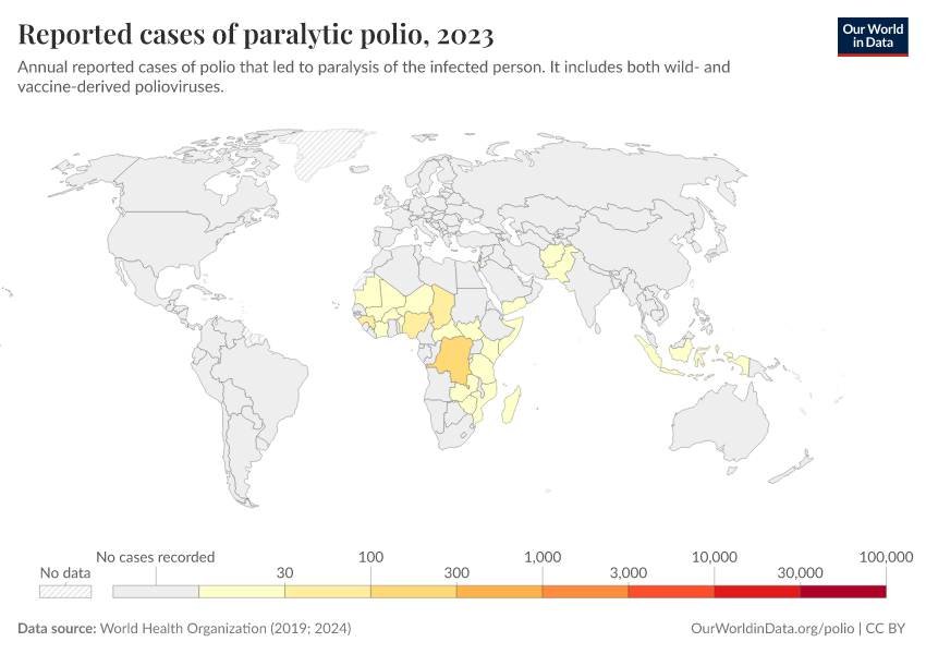 Meanwhile, in the countries shown in yellow – India, the Philippines, and Malaysia, as well as many countries in Africa – there was inadequate testing to confirm whether potential cases had polio.