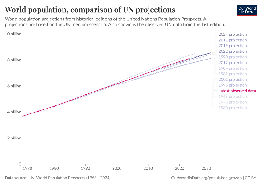 Hannah Ritchie (2023) - “The UN has made population projections for more than 50 years – how accurate have they been?” Published online at OurWorldinData.org. Retrieved from: 'https://drop-density-mdim.owid.pages.dev:8789/20251125-173858/population-projections.html' [Online Resource] (archived on November 25, 2025).BibTeX citation
