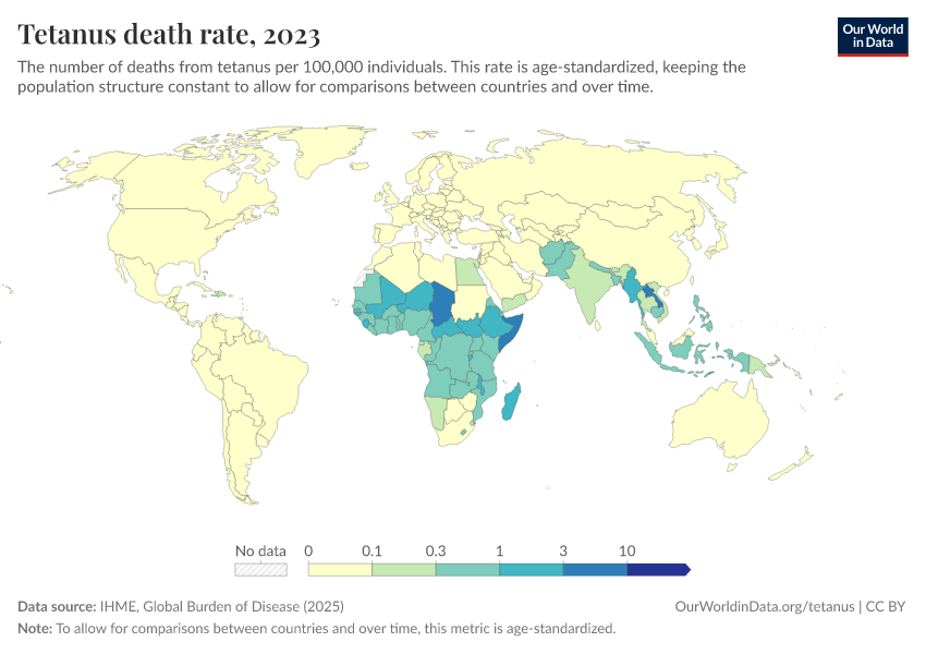 Hannah Behrens, Sophie Ochmann, Bernadeta Dadonaite, and Max Roser (2019) - “Tetanus” Published online at OurWorldinData.org. Retrieved from: 'https://drop-density-mdim.owid.pages.dev/tetanus' [Online Resource]BibTeX citation