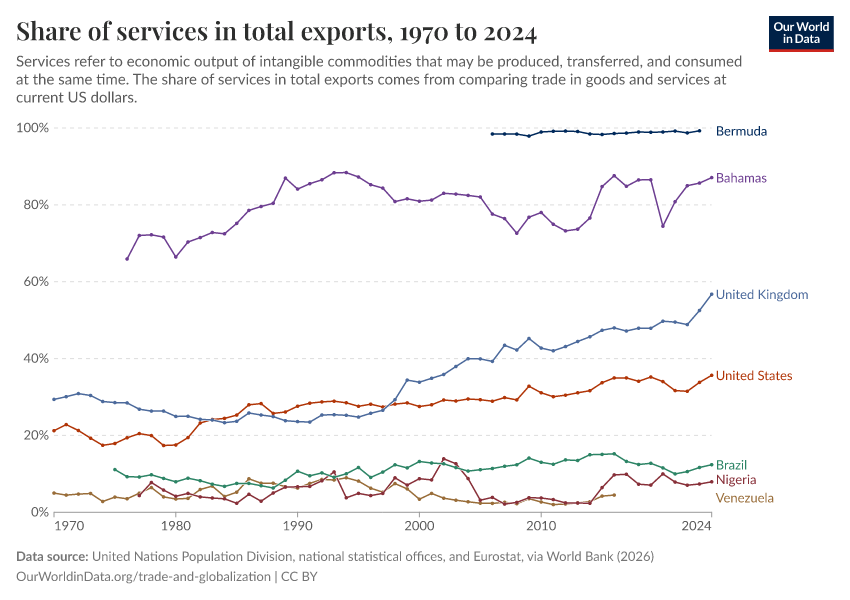 In some countries, services are today an important driver of trade: in the UK, services account for around half of all exports, and in the Bahamas, almost all exports are services.