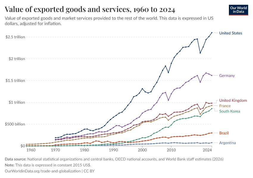 The chart shows the value of exports (goods and services) in US dollars, country by country, after adjusting for inflation.