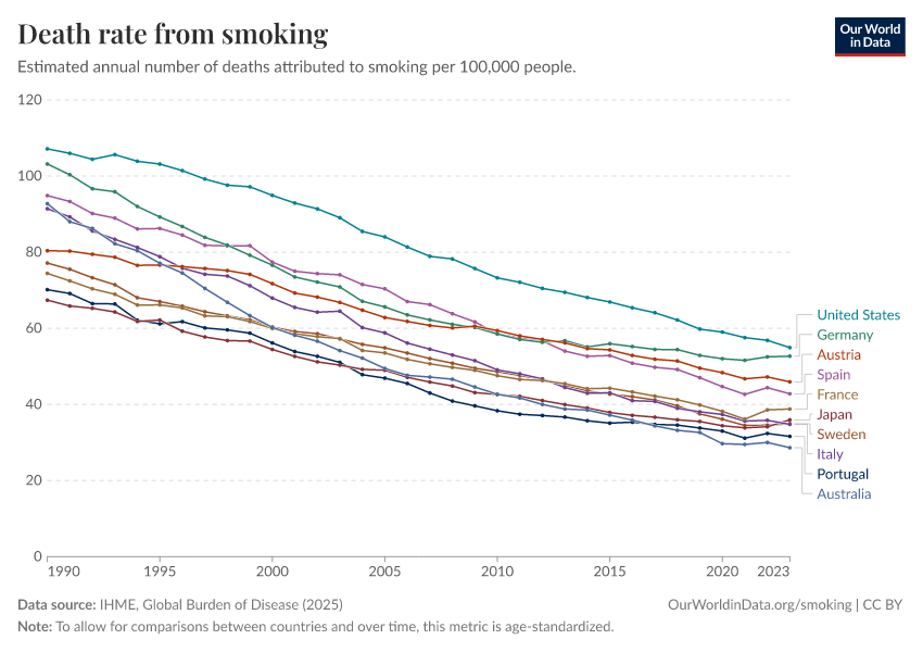 But the data also shows that smoking peaked earlier in the US. Since there is a lag of two to three decades between the peak of smoking and the peak of smoking mortality, this should be positive news for the US going forward. The country is over this mortality peak and we should expect the decline in lung cancer death rates in the US to continue in the coming years.