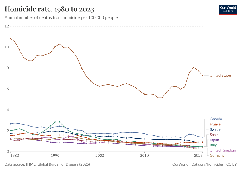 This chart compares homicide rates in the US with a number of other rich countries. No matter which other rich country you add to the chart, you won’t find one with a higher homicide rate. The homicide rate in the US is much higher than in other rich countries.