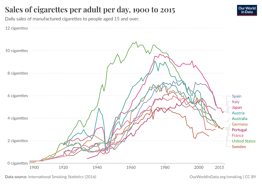 Smoking was extremely common in today’s rich countries between 1950 and 2000 as the chart below shows. Smoking was more widespread in the US than in Europe or Japan. As a consequence Americans died at higher rates from the consequences of smoking as the second chart shows (most of these people died from lung cancer).