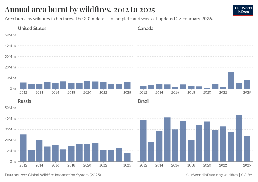 Veronika Samborska and Hannah Ritchie (2024) - “Wildfires” Published online at OurWorldinData.org. Retrieved from: 'https://drop-density-mdim.owid.pages.dev/wildfires' [Online Resource]BibTeX citation