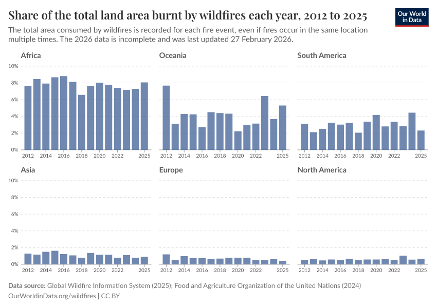 Africa tends to be the region with the largest share of area burned — typically ranging from 6% to 8% each year. Figures tend to be lower in other regions but can vary a lot from year to year.